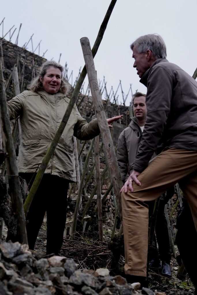 Besides being the gastronomique capital of France, Lyon is well situated to wine country with Beaujolais just to the north and the start of the Rhone Valley to the south. The Rhone Valley starts with Côte Rôtie, one of the great syrah based wine regions of the world. We booked a visit with one of my favorite, very small, but pre-eminent producers – Vignobles Levet (represented in the US by Neal Rosenthal, a sure mark of excellence). We had a 9:30am appointment on a frigid Saturday morning and I was afraid it might be just a short wine tasting, when my real goal was to learn about the vineyards. We were greeted by winemaker proprietor Agnes Levet, who indeed took us on a long walk up into those crazy rock terraced vineyards.
